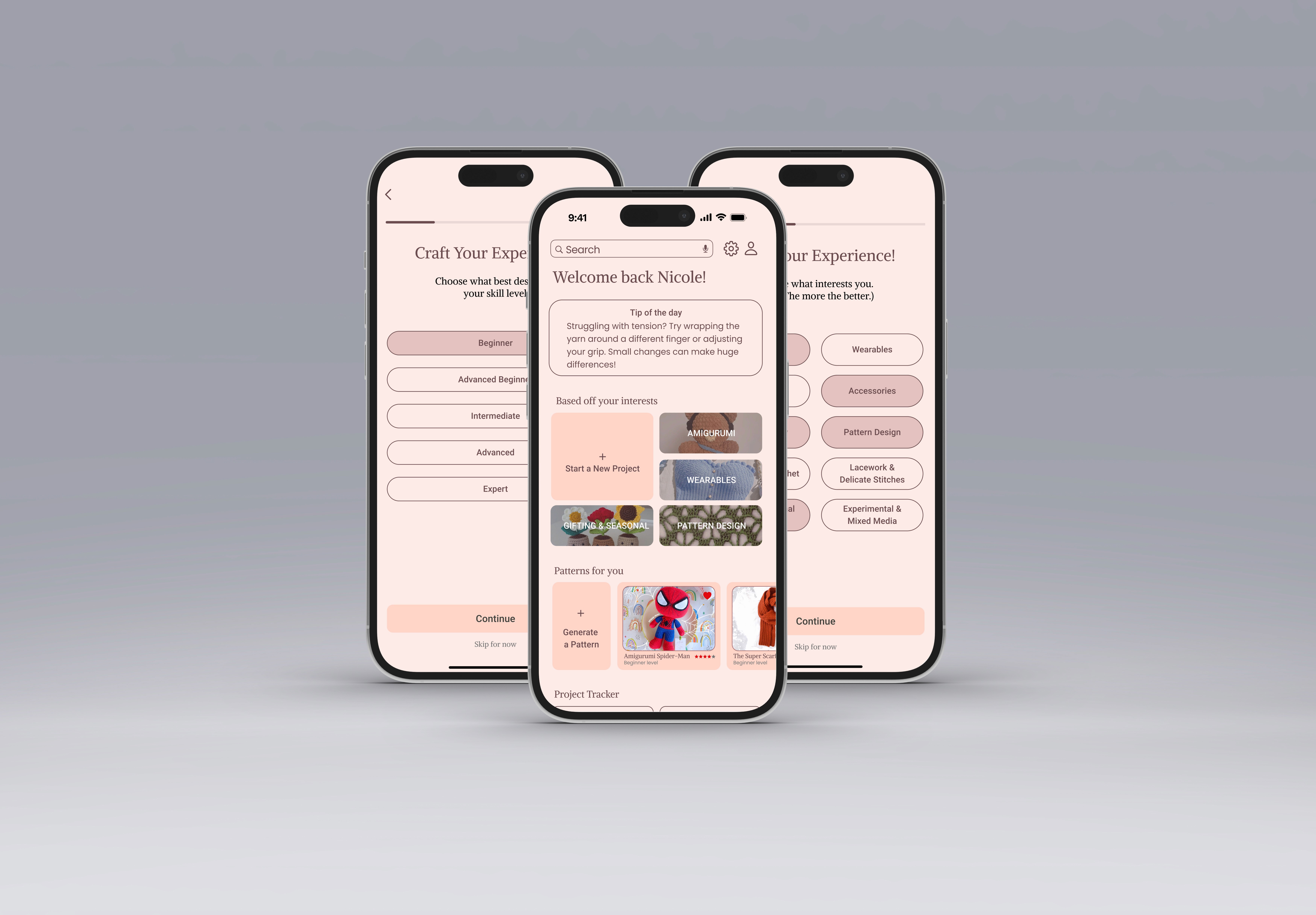 The design focuses on clarity and personalization, using a warm visual language to create an approachable experience across platforms. The result is a connected system that supports users in tracking progress, exploring patterns, and building projects at their own pace.
